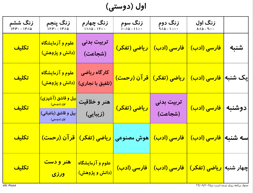 برنامه هفتگی دانش آموزان دخترانه شمیم هدایت (پادهانیس) سال تحصیلی 1405-1404
